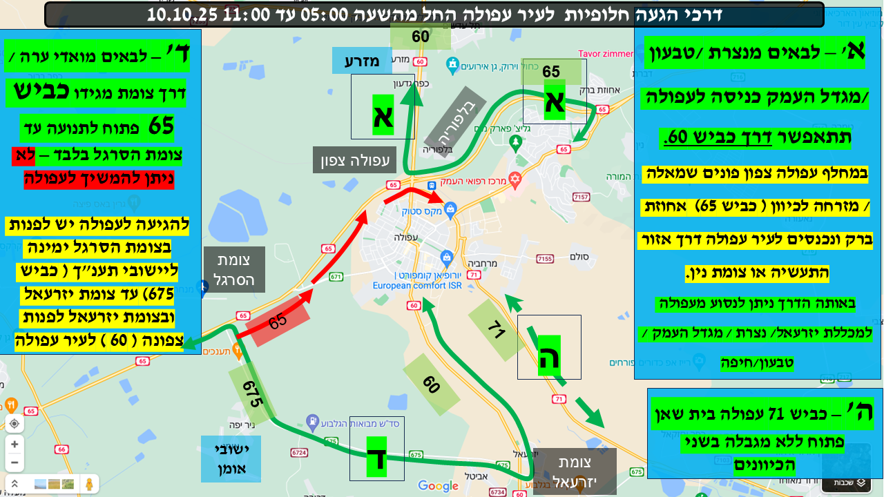 . למי שמגיע לצומת הסרגל לאחר השעה 04:45 הכניסה לעפולה ממערב ( לבאים מאזור המרכז ) תהיה דרך צומת הסרגל, ימינה לכביש 675 ואז דרך צומת יזרעאל (כביש 60). ההגעה לוקחת קצת יותר זמן – אנא קחו זאת בחשבון – מצורפת מפה.